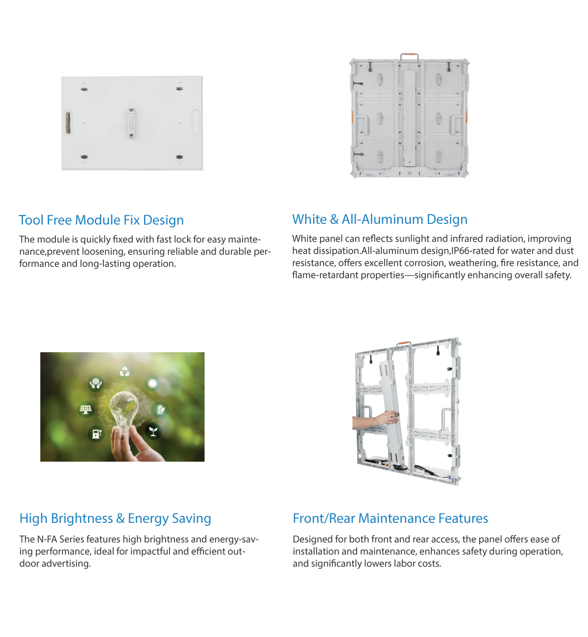 The N-FA Series is a full-color outdoor fixed LED display designed for commercial advertising applications. Featuring a sleek white chassis, it offers superior heat dissipation and supports both front and rear service access, ensuring easy maintenance and reliable performance in all environments.