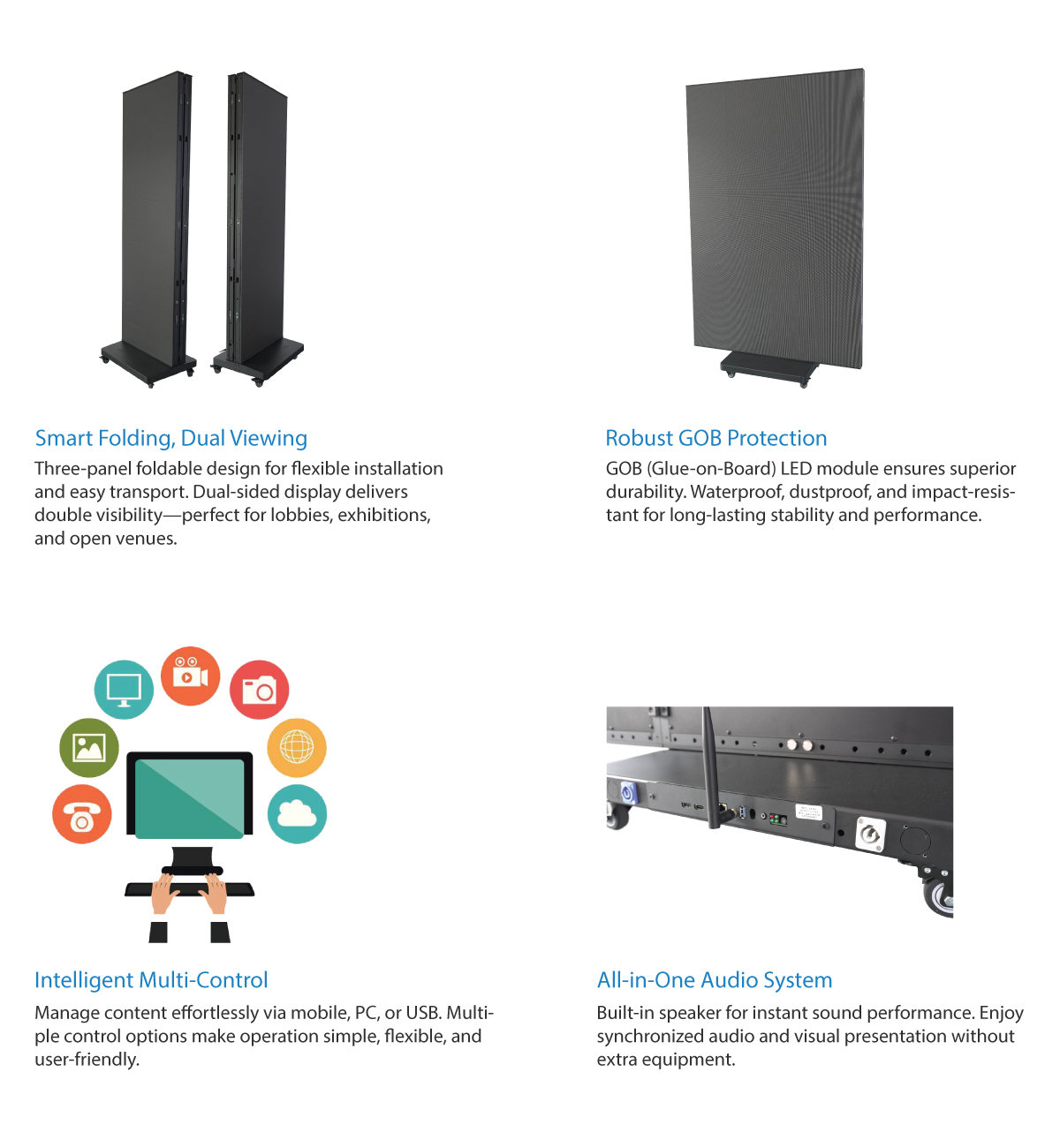 Designed for modern commercial display and events, the Tri-Fold Banner brings an innovative visual experience. With its foldable structure, dual-sided viewing, and intelligent control system, it blends versatility with elegance in one compact design.